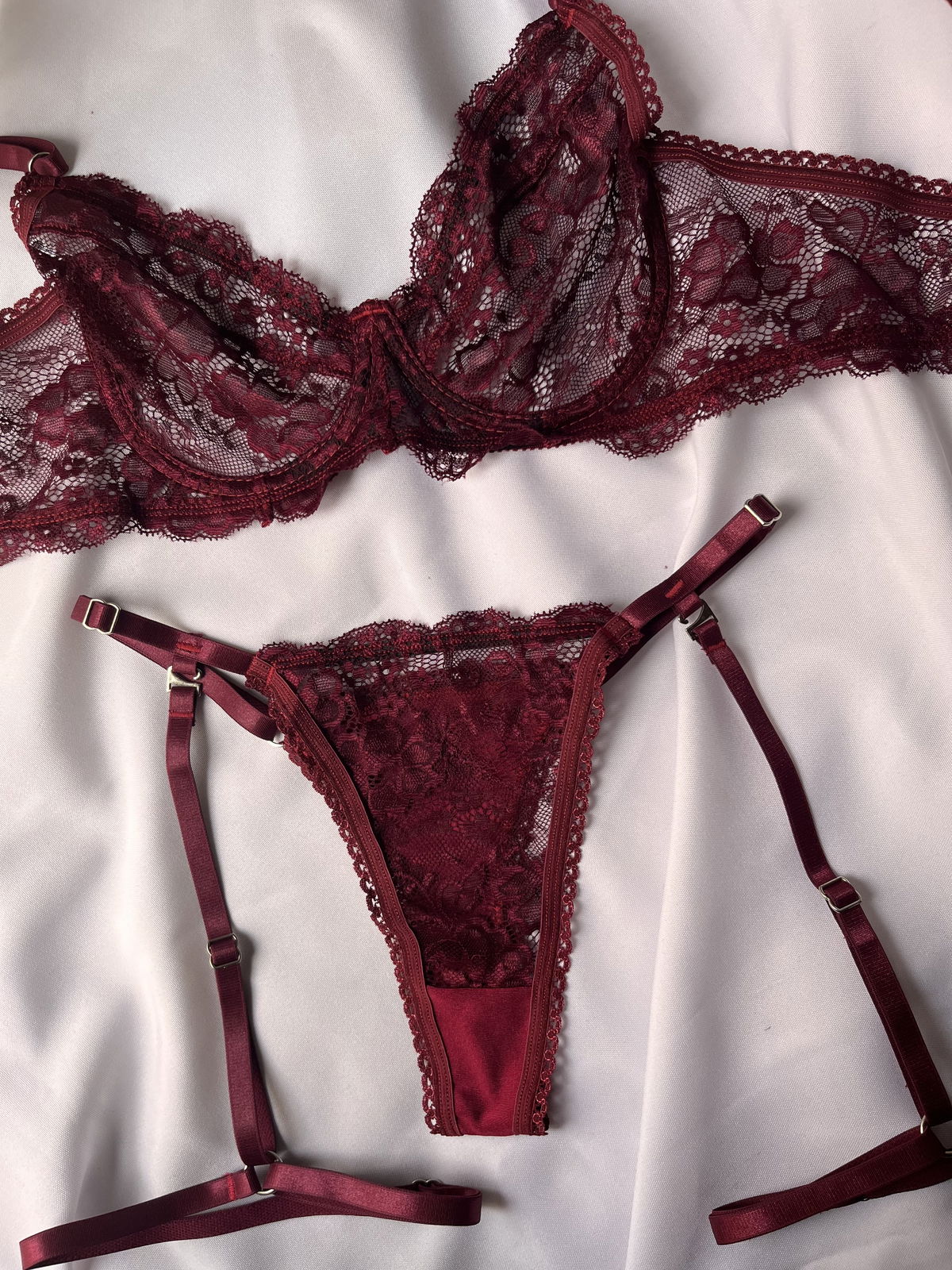Conjunto de encaje con aro con less regulable en talles 38 ,40 y 42de pantalón. Incluye ligas desmontables!