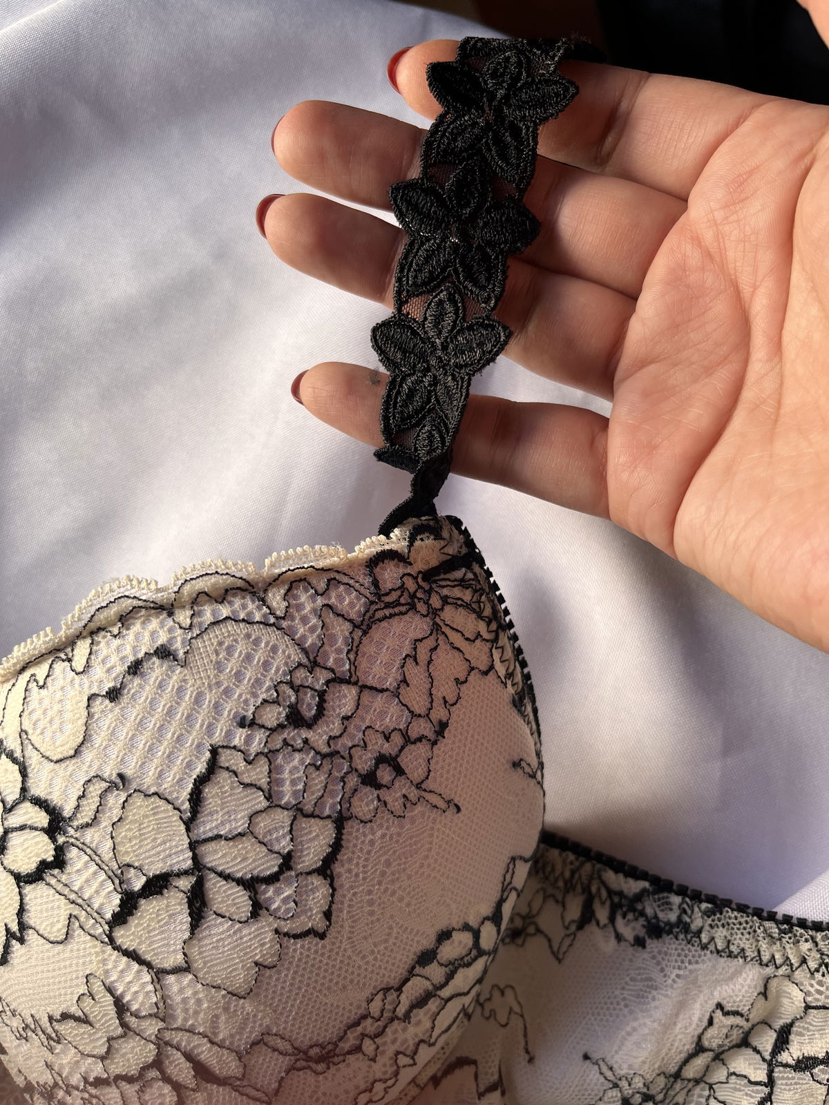 Conjunto de encaje con aro y taza. Detalle de flores en el bretel. Less regulable en talles 38,40 y 42!