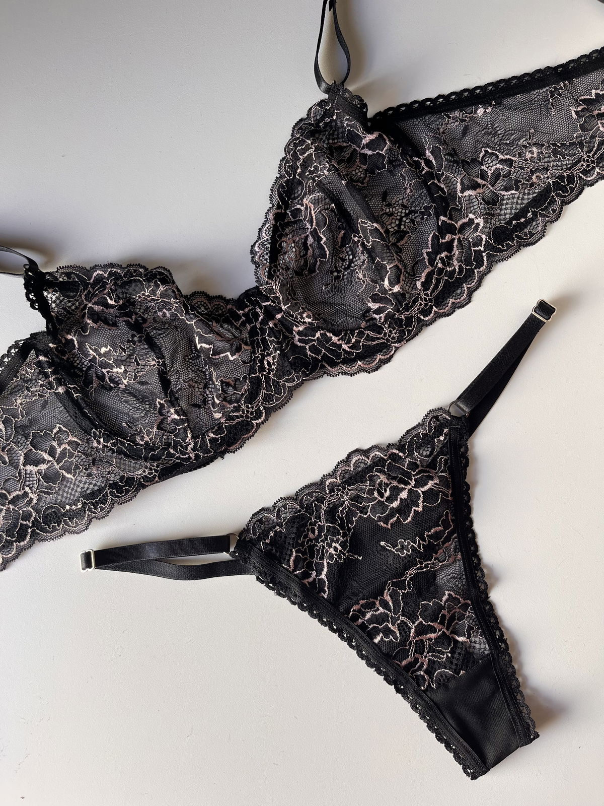 Conjunto de encaje negro con detalles con less regulable en talle 38, 40 y 42 de pantalón