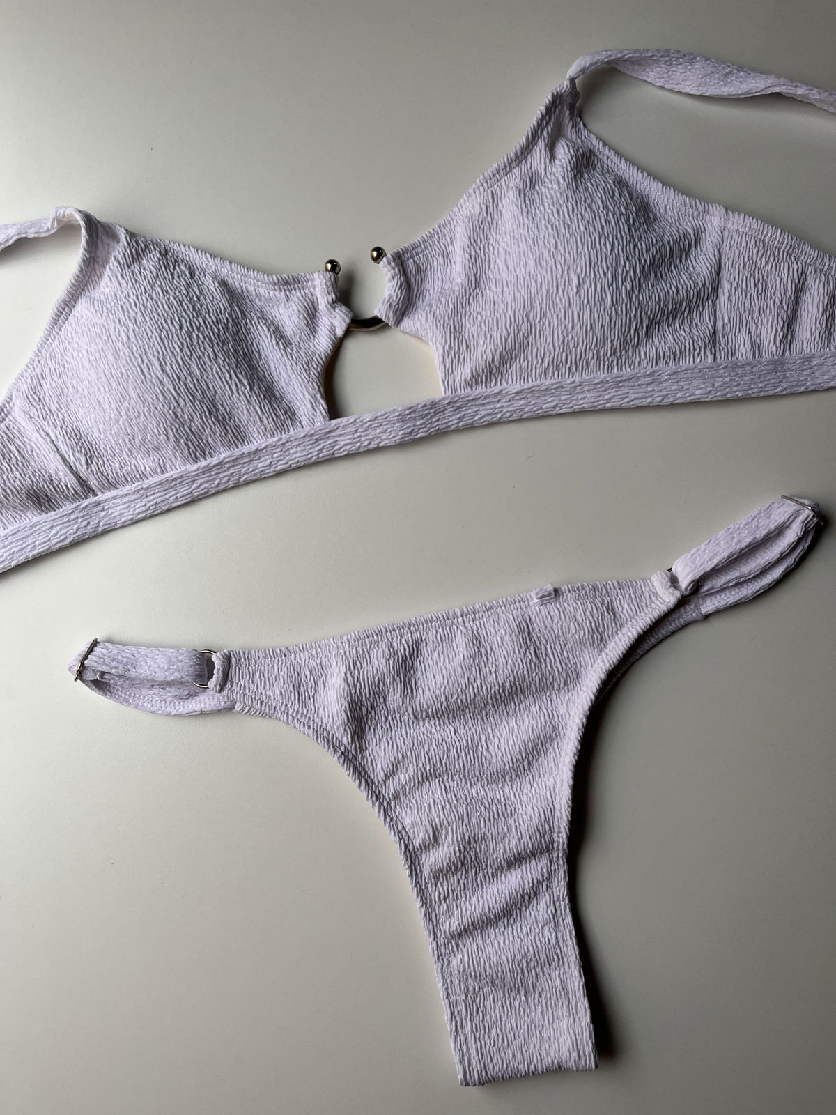 Bikini texturada con tazas soft desmontables. Less regulable en talles 38,40 y 42 de pantalón. Aclarar talle de la less al final de la compra!