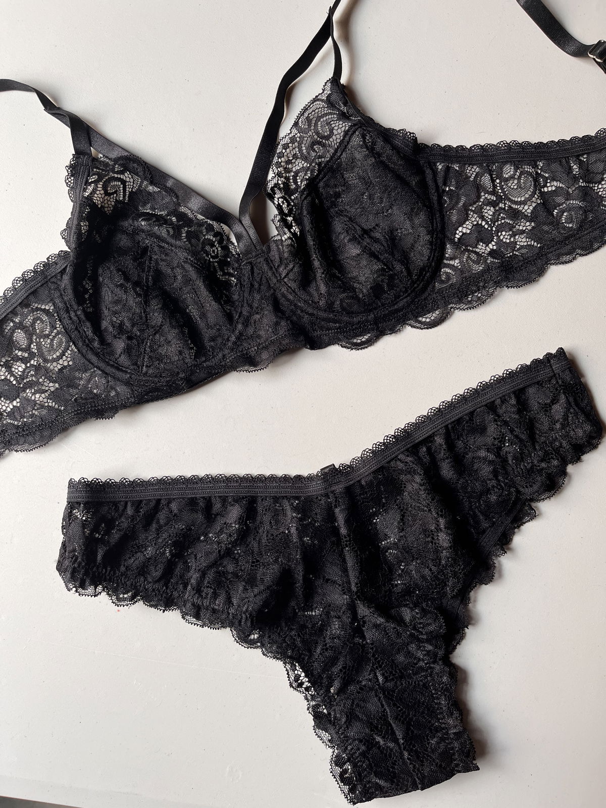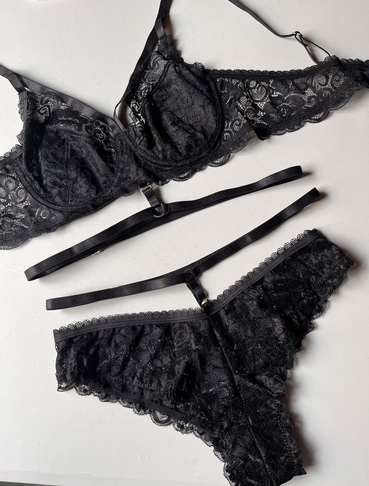 Conjunto de encaje con detalles de arneses desmontables y less en talles 38,40,42 y 44 de pantalón 🙌🏽